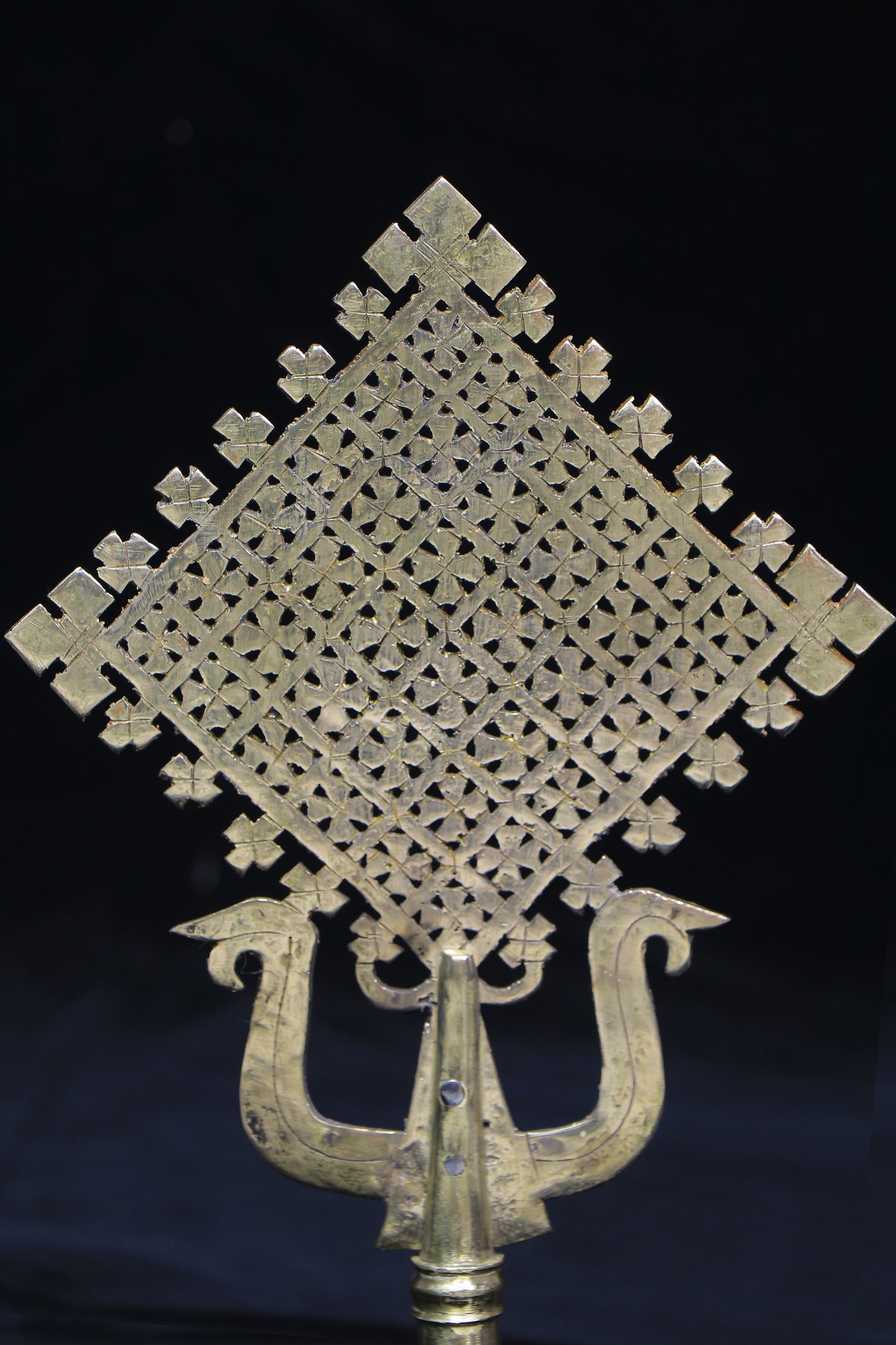 This exquisite 35cm Ethiopian processional cross is a masterpiece of traditional Coptic Christian craftsmanship. Handcrafted by skilled Ethiopian artisans using time-honored brass-working techniques, this blessing cross embodies the sacred artistry and spiritual heritage of Ethiopian Orthodox Christianity.